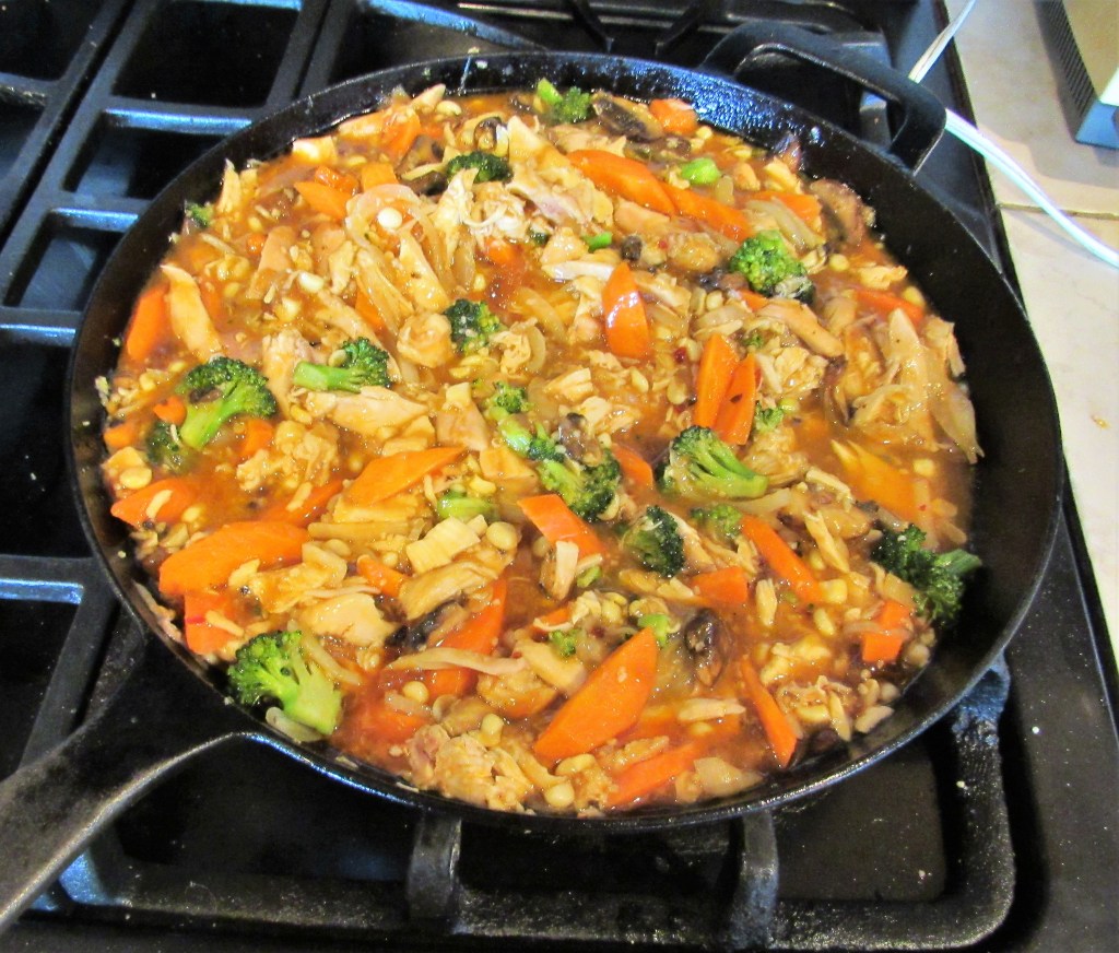 I still had some of my rotisserie chicken that needed to be used so into the skillet it went and came out as an easy-peasy, delicious chicken and vegetable stir-fry. Stir-fries are endless in possibilities. All you need is some imagination and creativity and then mix it all together to see what comes out.