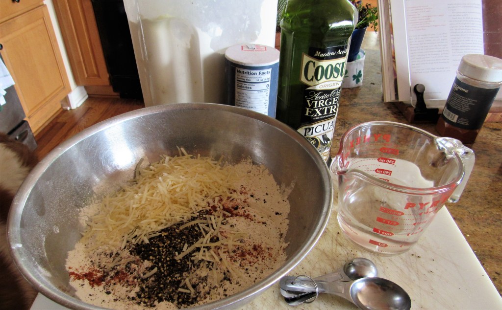 Combine the rest of the regular flour, salt, cayenne pepper, crushed peppercorns, Parmigiano cheese, water and the 2 TBSP of olive oil and mix everything together thoroughly. Then add the starter and incorporate it into the mix.