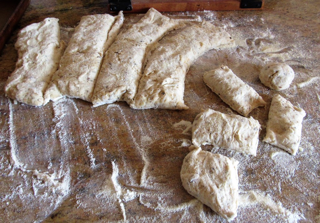 Once everything is fully combined, on a lightly floured surface, shape the dough into a 15×5 rectangular shape, brush with olive oil, cover it loosely with plastic wrap and let it rise for 1 1/4 hours.