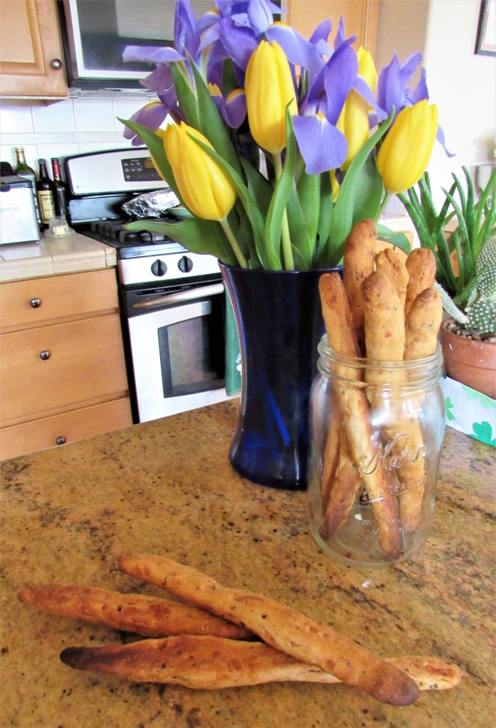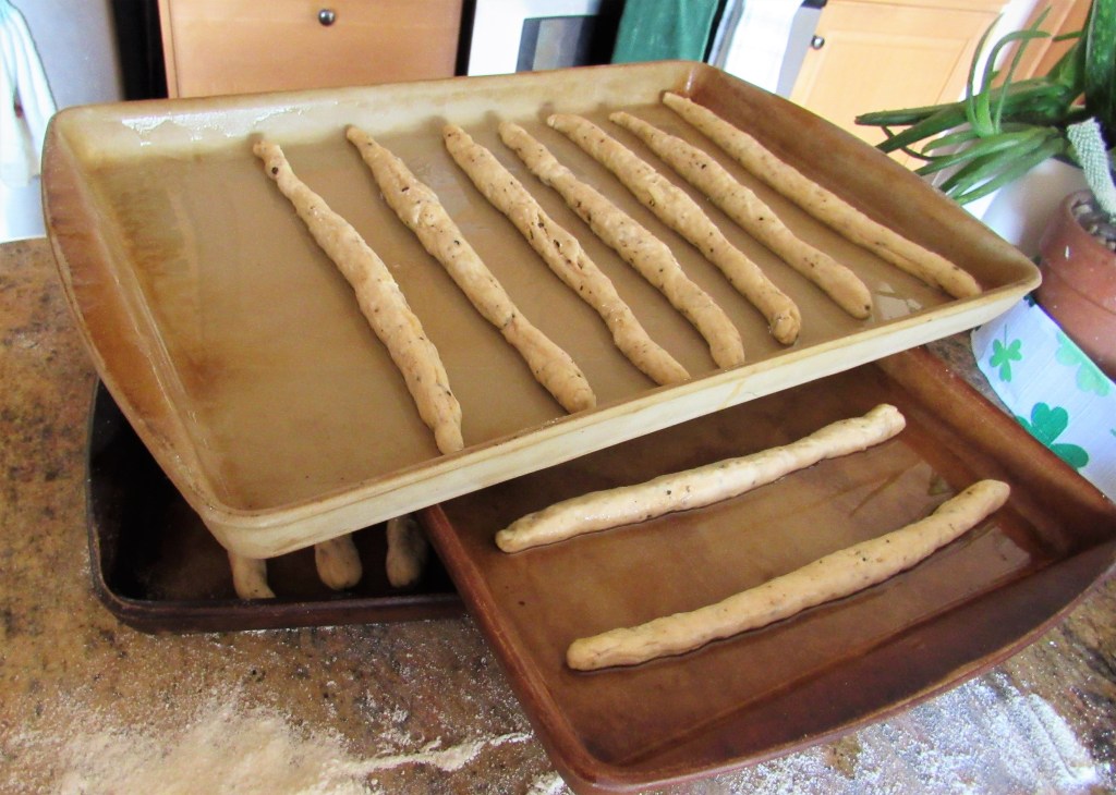 These are very good as is, or served with either pesto or marinara sauce on the side. I made a pesto this time and served them with that. Man cannot live on bread alone; sometimes you need a sauce to go with it. These breadsticks were a big hit with everyone and they all quickly disappeared too.