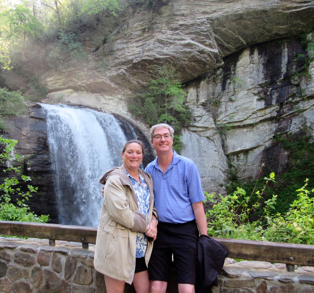 As I mentioned in my post First Stop – Charlotte, North Carolina we drove all over North Carolina, Virginia and West Virginia. (We left just in the nick of time too. Had we stayed just one day later, we would have been in a real bind. We left the day before the pipeline hack that left much of the country, including the states we were visiting, with very limited gas supplies.) After a stopping at Parker-Binns Winery and dining at Dat’s Cajun Cafe in Hendersonville, More Stops on Day One we were ready to let our driving adventures begin. We decided to take the scenic route and drove across North Carolina along the Blue Ridge Parkway that runs through the Blue Ridge Mountains. WOW! It was a gorgeous route. Even though I live in mountain country, (we have our beautiful Rocky Mountains) the Blue Ridge Mountains are totally different and offer a completely different kind of beauty and charm than the mountains we have here at home. But before embarking upon the Blue Ridge Parkway, we stopped at this beautiful water fall.