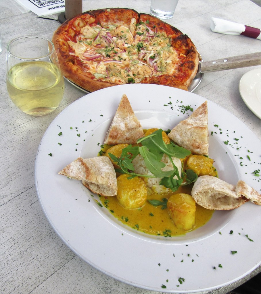 Because we like to try so many different foods, we often share meals or get an appetizer and a meal to share between us. We started with curried scallops and paired it with the chicken tikka pizza. Great combination! I love all three – pizza, Indian foods and curry, but I had never thought of combining pizza and Indian food together before. We LOVED it!!!!! I will have to make some chicken tikka pizza here at home home of these days.