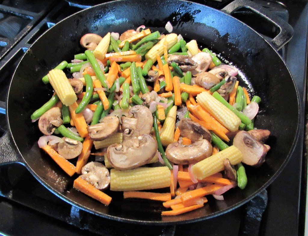 I like lots of vegetables in my foods too, so I cut up a bunch of vegetables and sauteed them in hot oil. This time I used baby corn, green beans, mushrooms, sweet potato and a shallot, all sliced very thin or cut in matchstick style.