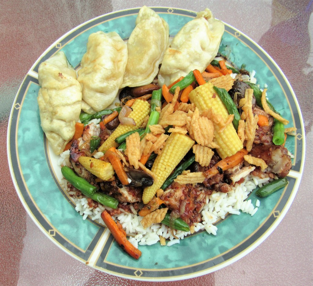 We had some pork chops down, and Larry decided he wanted something with an Asian flair. I went through my extensive library and came up with something both different and delicious. I decided on making some hoisin pork chops that I served with some Asian vegetables, rice, and some fried potstickers, with wine on the side, of course.