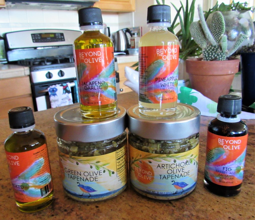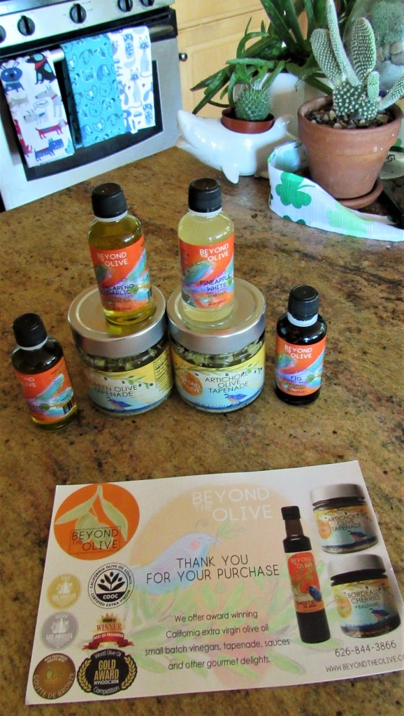 Yesterday, I received a goodie package in the mail from Beyond The Olive located in Pasadena, California. Beyond The Olive is owned and operated by Lisa Grabow. I spoke to her and thanked her for my fabulous goodie package, and you can just tell from talking to her that she takes great pride in her olive oils, vinegars, and all of her products. I love her enthusiasm. Not only do I love supporting small businesses, but I especially love supporting small businesses from my hometown of Pasadena. WHOOOOO HOOOOOO!!!!! Go Pasadena!!!!!! 🙂