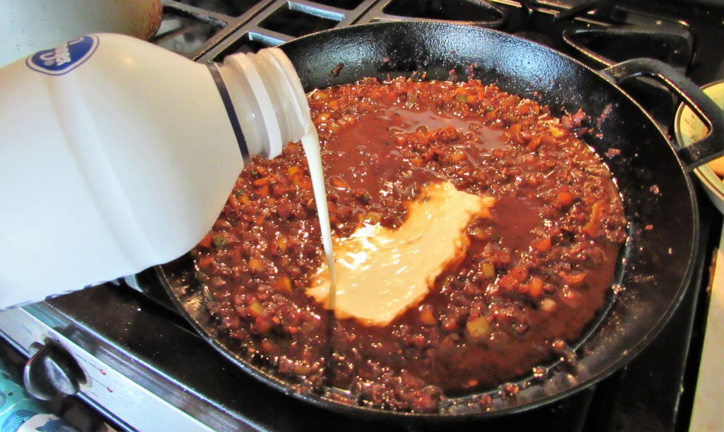 Once the flame dies down, mix everything together well and bring to a boil, then reduce the heat to a simmer, and continue to cook for about 5 minutes, stirring constantly. Add the cream and incorporate well.