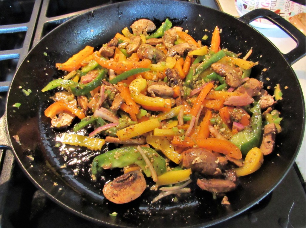 I sliced some bell peppers, onions and mushrooms, and sauteed them with some with seasonings. I cooked the meat separately and added my wild game seasoning that I bought from Wally’s Quality Meats. Wallyβs Quality Meats