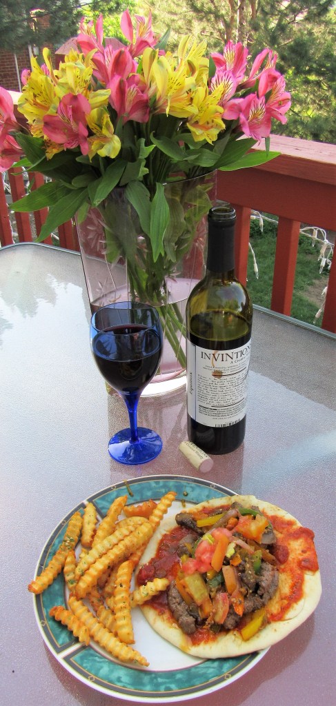 For my sauce, I mixed a little salsa and the remainder of my roasted red pepper vinaigrette together, and then spread it out onto a warmed pita. Once everything was all cooked to perfection, it was time to piece it all together and enjoy. As usual, I put to much stuff on my stuff, so it was very messy. But messy ALWAYS tastes oh so good. We added some French fries on the side, and had a delicious summer dinner out on the deck. I served it with a big red blend on the side too.