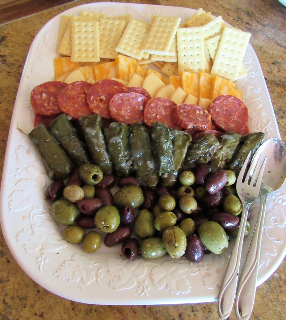 Aside from these being so easy to make, they are also very versatile. I made mine with a couple of types of cheese, some crackers, dolmas (stuffed grape leaves), 3 different kinds of olives and some sliced hard salami. But as always, you can make them as simple or elaborate as you like, and can use a whole host of ingredients. Just use your imagination and let your taste buds guide you.