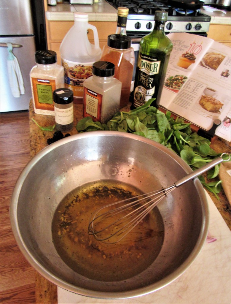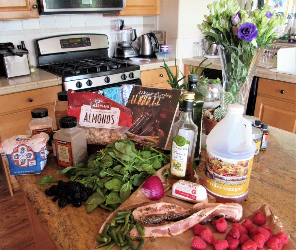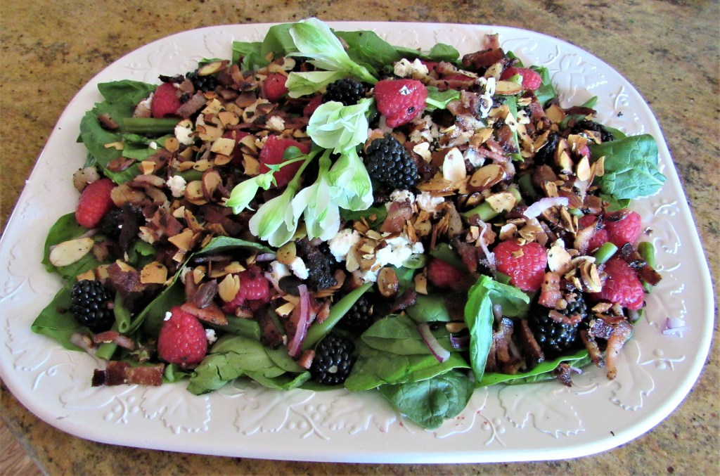 This colorful salad was loaded with all kinds of fresh, seasonal goodness, like blackberries, raspberries, red onions, green beans, baby spinach, goat cheese, bacon and toasted almonds. This salad is both colorful and nutritious. It was a big hit with all my guests too. As with all of my recipes, use what you like and forget the rest.