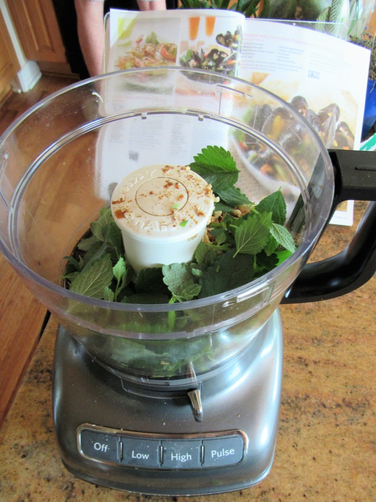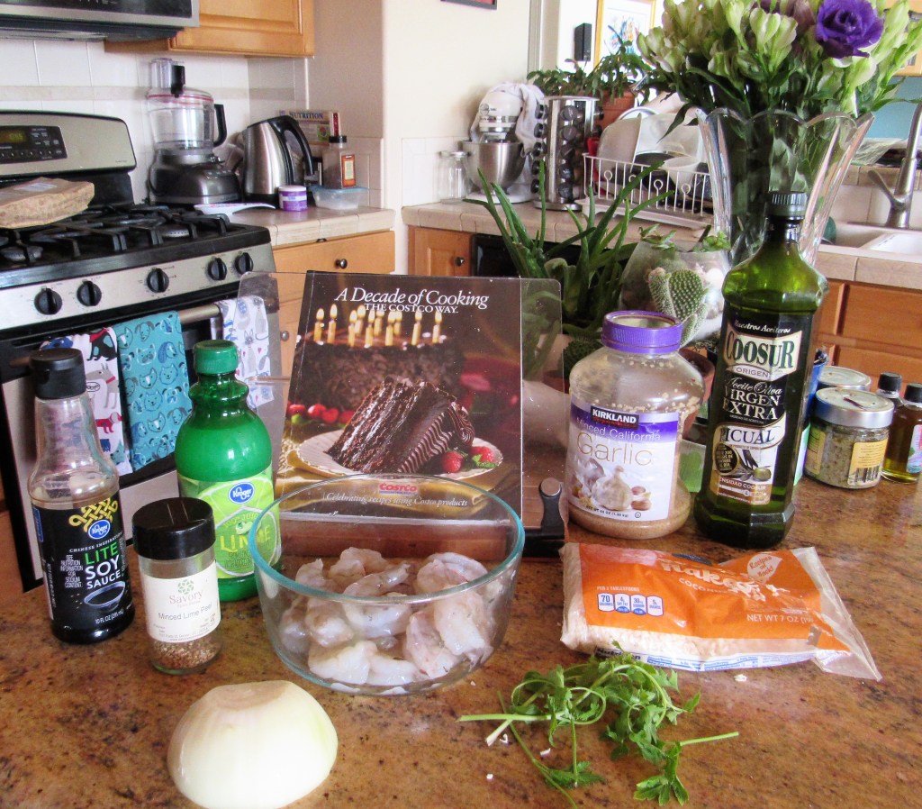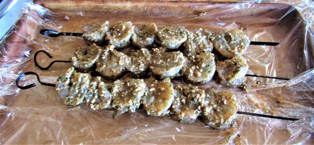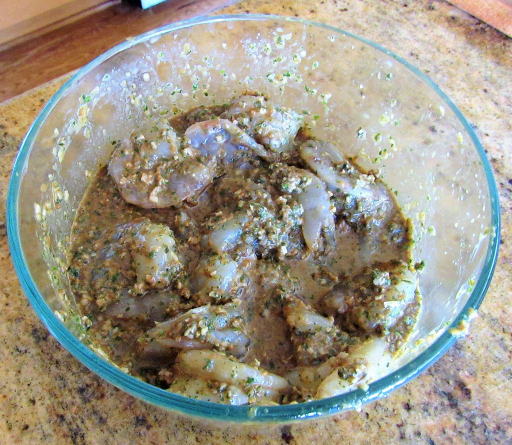 Mix all the ingredients in the food processor until you have a liquidy paste. Then add the shrimp and marinate for about 1/2 hour in the refrigerator. I forgot to buy cilantro and I thought I had enough, but I did not. Fortunately though, I have a whole backyard filled with lemon verbena. So lemon verbena to the rescue.