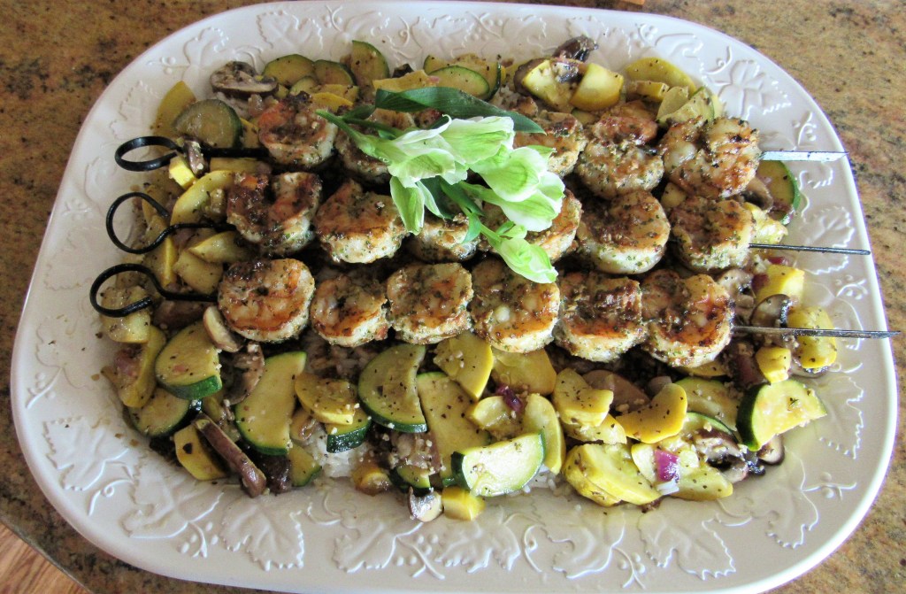 This recipe for coconut lime grilled shrimp is so easy to make and it came out very good too. I served it over rice, that I topped with some of the remaining sauce and sauteed summer vegetables. It was a quick and easy lunch we shared with our friend Jonathan after church.