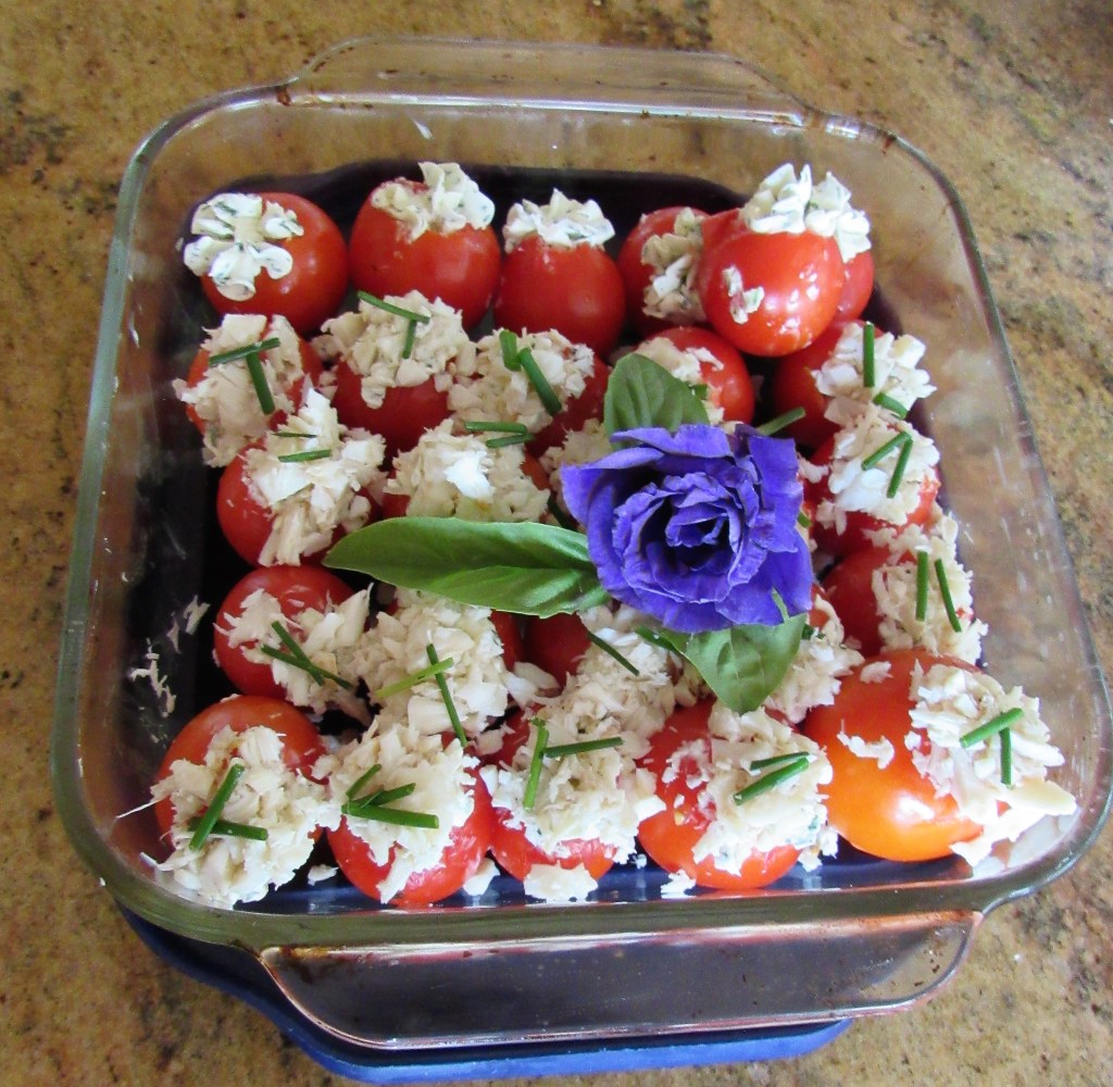Larry’s company picnic was today. It was at a beautiful park in Northglenn. The park had a big lake where people could paddle around in the paddle boats, though there were no a lot of paddle boaters out on the lake today. There were lots of flowers, geese and ducks, and oh so much more too. There were about 20-30 people at the picnic. There was a wide range of BBQed items and typical picnic fare. Everyone had a good time, and most probably ate way too much good food. I was good though and only ate a little bit. Larry (and I) brought my herbed cream cheese and crab stuffed tomatoes. Herbed Cream Cheese and Crab Stuffed Tomatoes They were a big hit with everyone.