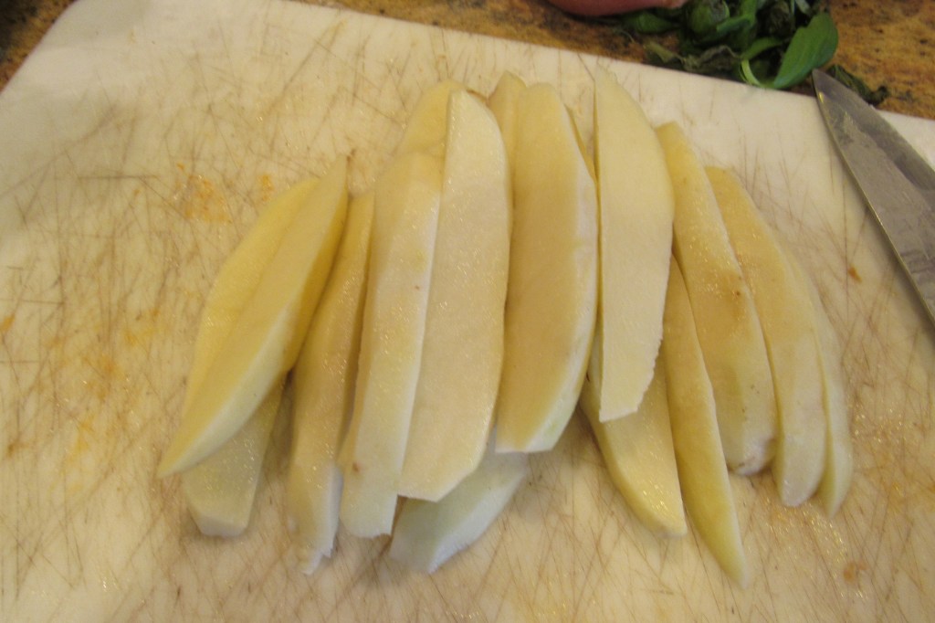 Cut the potatoes into wedges and place in cold water. Bring to a boil, then reduce the heat to a simmer and continue to cook for about ten minutes.
