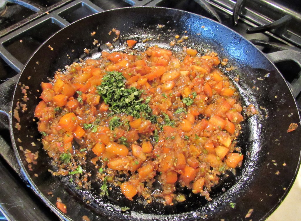 Add in the tomatoes and balsamic vinegar and continue to cook for about 10 minutes, or until most of the liquid has evaporated and you have a thick sauce.