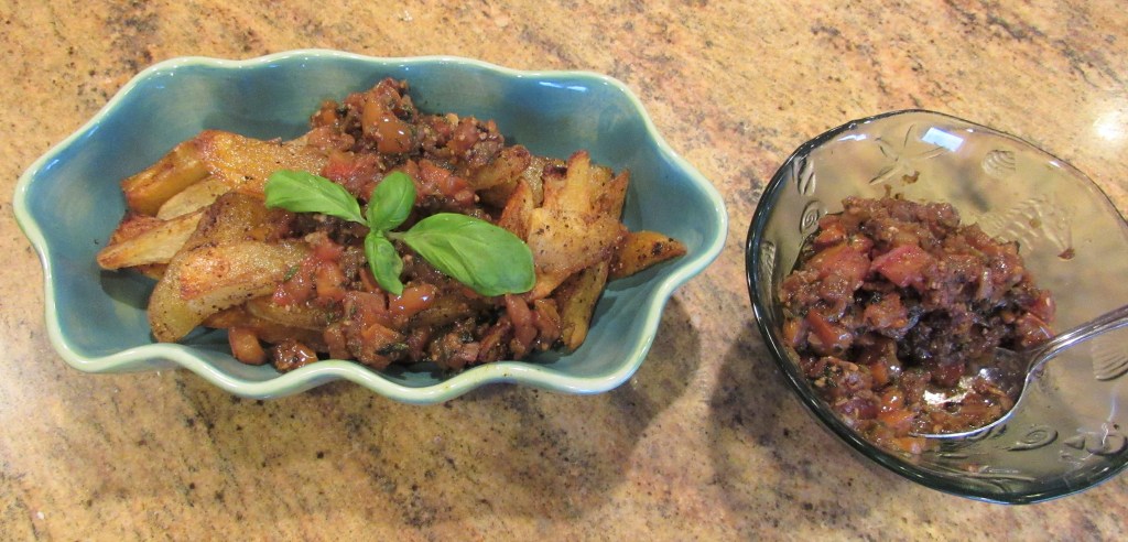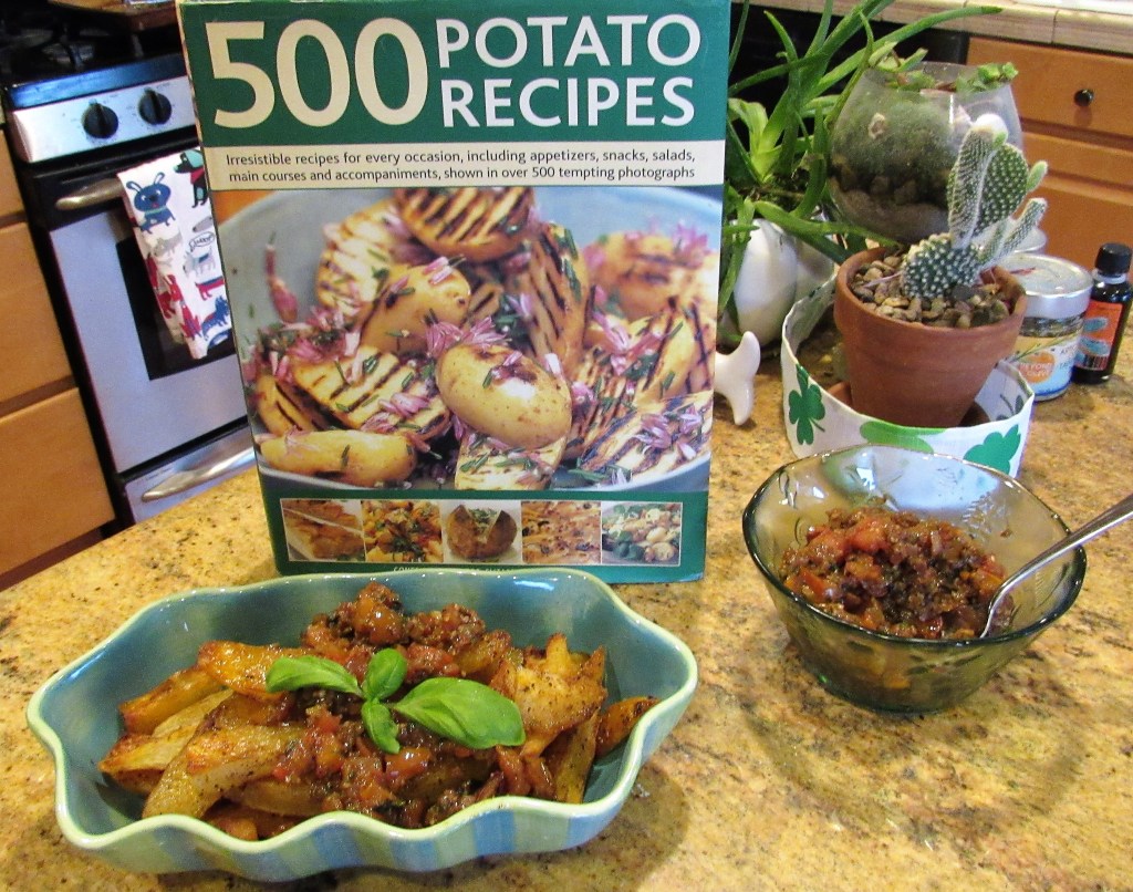These last few days have been very long and very busy with the end of my swim season. Our Final Meet of the Season – Day One, Our Final Meet of the Season – Day 2, but I have still been in the kitchen cooking a bit too. I made a ham, mushroom and red pepper quiche, but I needed something to go with my quiche. Potatoes and quiche are always a good combination in my book, but I wanted something a little different than just regular old potatoes. I decided on making some spicy potatoes with a tomato-jalapeno sauce. They are similar to patatas bravas Patatas Bravas, but just different enough to be considered something new. These potatoes were a very good choice to accompany my quiche.
