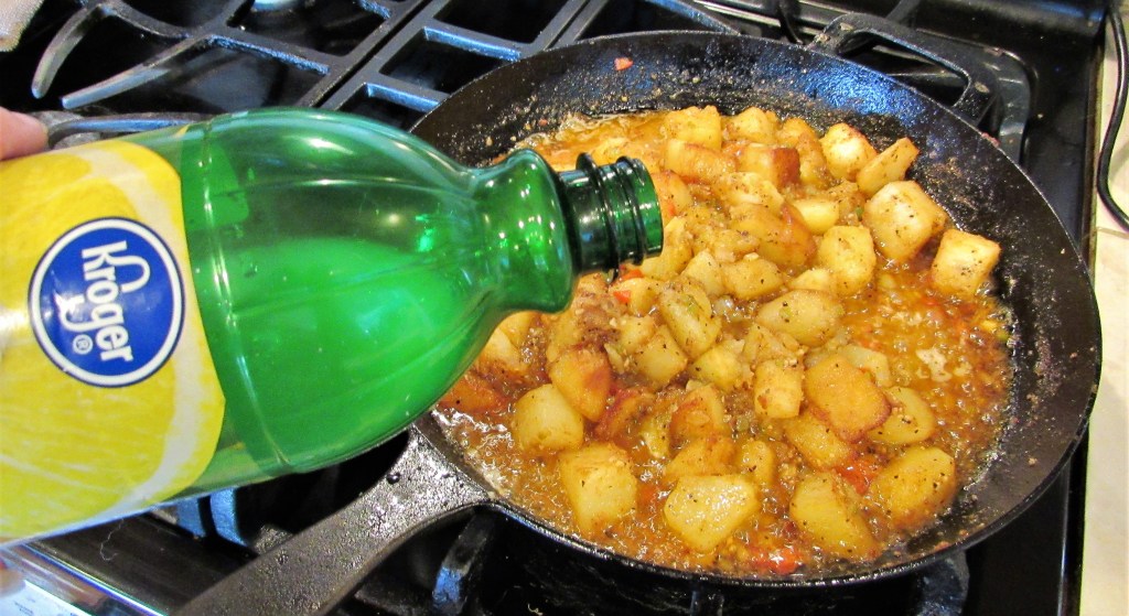 When the potatoes are browned, add the rest of the ingredients, except for the cilantro and the lemon juice, and continue to cook until the peppers and onions are softened and translucent.