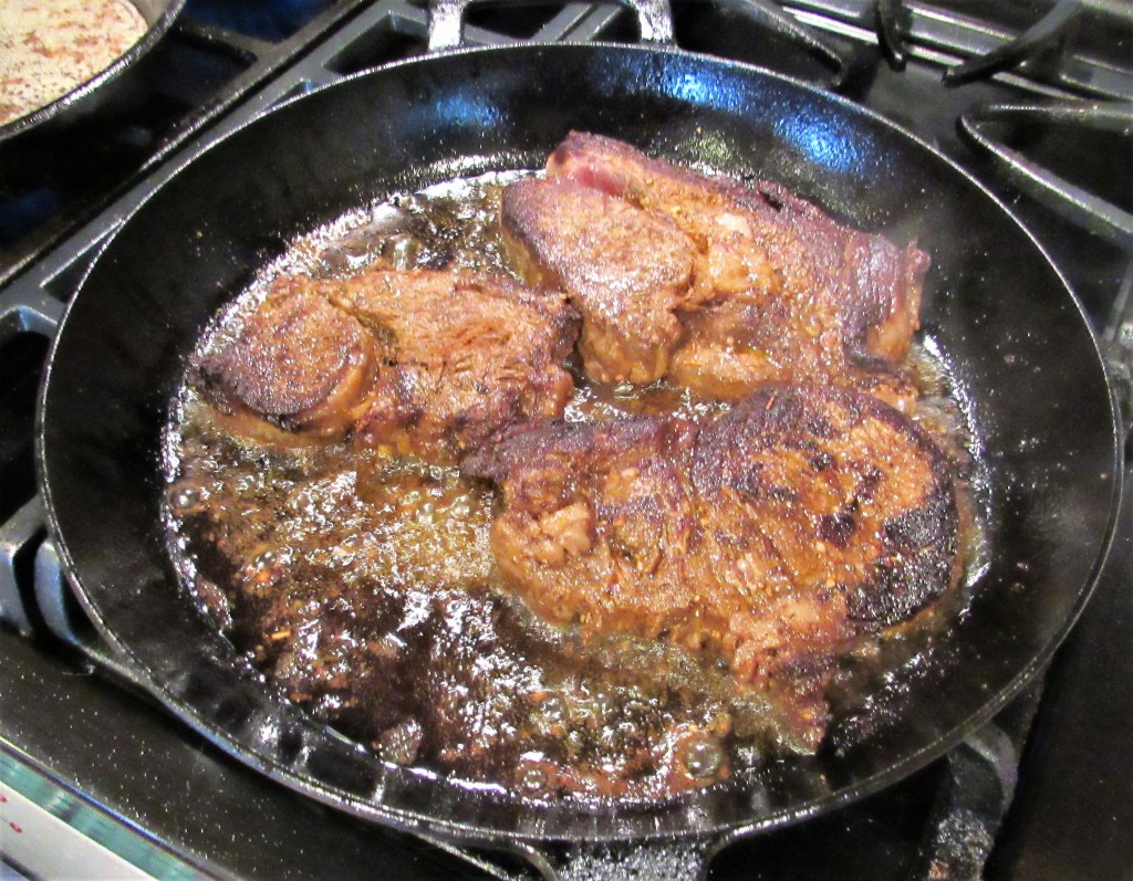 I was going to grill the steaks, but Mother Nature had other plans, and not long before I was going to put the steaks on the grill, we had a thunder and lightening show, complete with a heavy downpour, that suddenly changed my plans. Grilling outside was no longer an option. I needed to come up with a good plan B and fast. Searing the steak was a perfectly good plan B. I seared the steaks for 3 minutes per side, then again for another 1-1 1/2 minutes. I used a timer to make sure I did not over cook the steaks. I have cooked many a steak in my day, and this method for searing is hands down my favorite. It allows for the steak to brown and crust perfectly with keeping the inside still nice and tender and rare. In a word – PERFECTION!