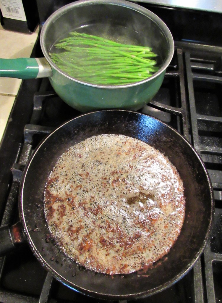 You can either grill or boil the asparagus. This time I boiled mine, then drained them before tossing them in the lemon butter.