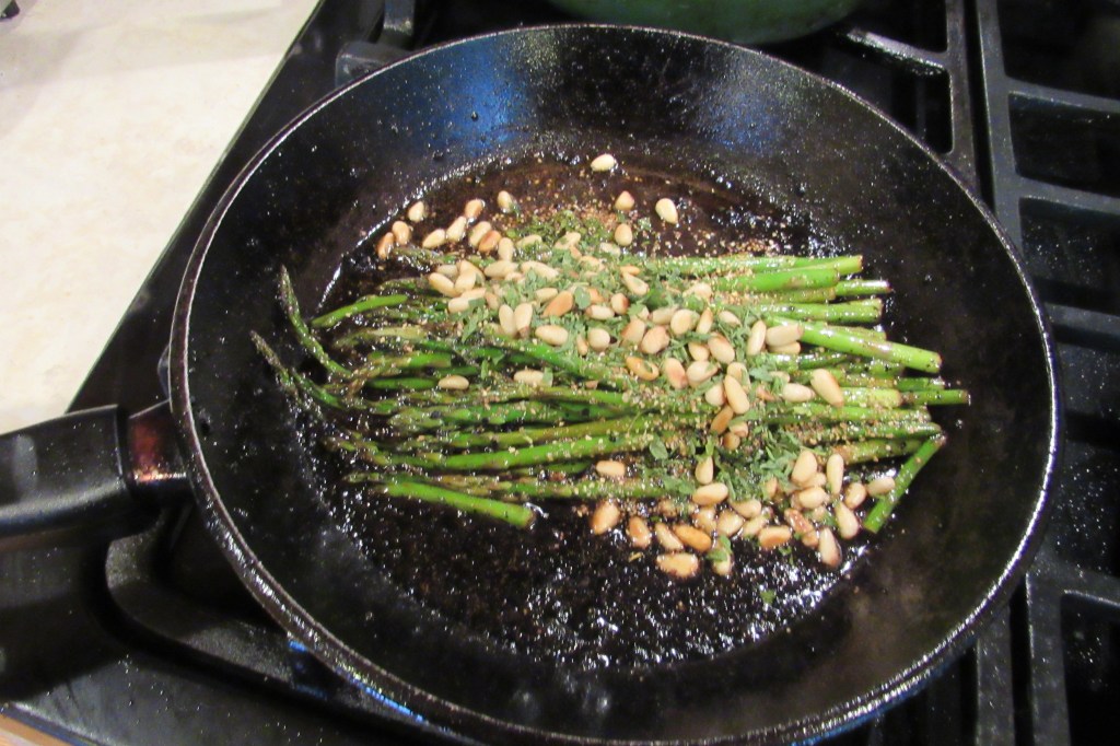 Add the asparagus spears and thoroughly coat in the lemon butter mixture. Right before serving, add the lemon zest, parsley and pine nuts. Serve immediately. I tend to like the smaller, thinner asparagus, but you can use any size you like. however, if you are going to grill the asparagus, the thicker ones are better.