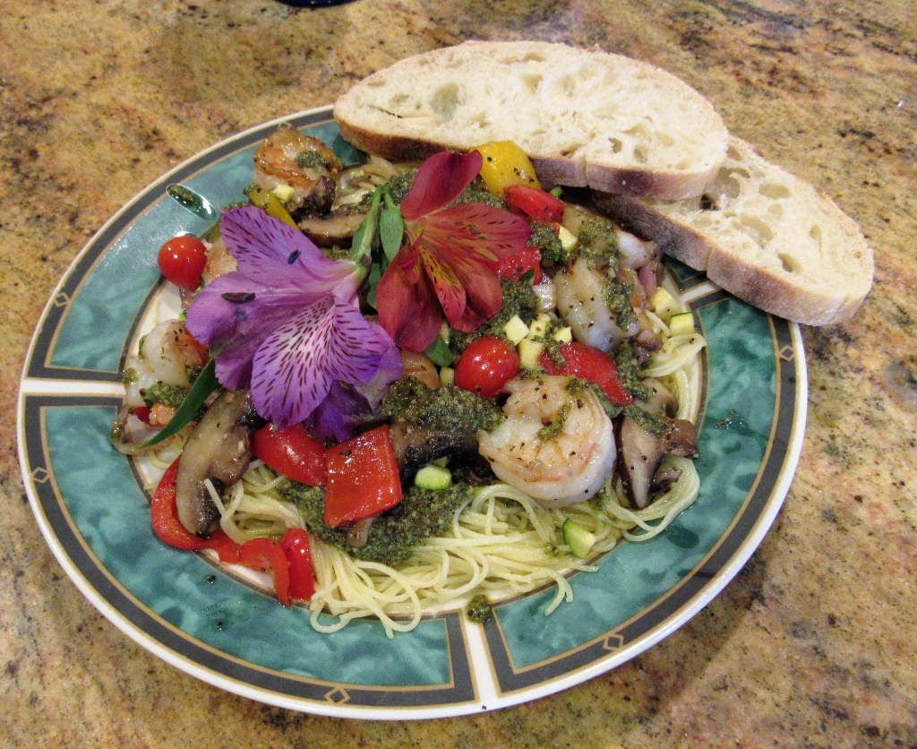 Then it was time to plate everything up. I started off with my cooked angel hair pasta, then a layer of pesto sauce, followed by the main attractions, and more pesto on top. Some warmed ciabatta and chilled chardonnay completed the meat and made for a perfect summer supper. It was quick, easy to make, healthy and very tasty too. Who could ask for anything more? 🙂