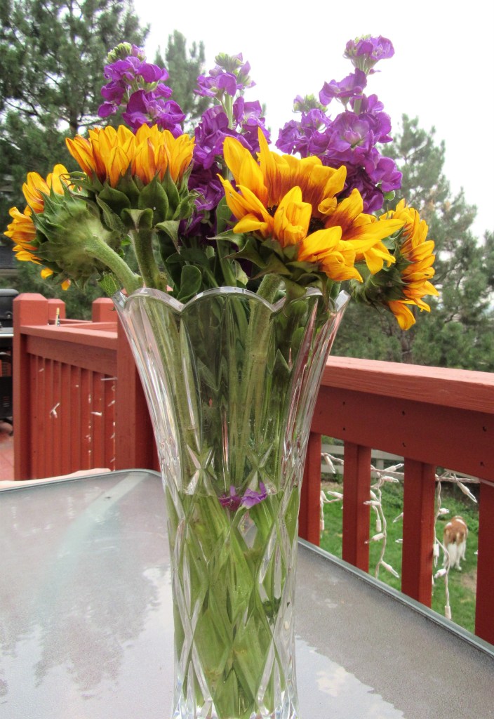 I love the bold, vibrant combination of purple and yellow flowers. They just seem to beg you to take notice. Sunflowers of all variations are some of my favorite flowers and i used them a lot. I also love to mix and match them with other flowers too. This time I believe I mixed them with sweet peas, but for those of you flower aficionados, please correct me if I am wrong. All I know they are beautiful and very fragrant.