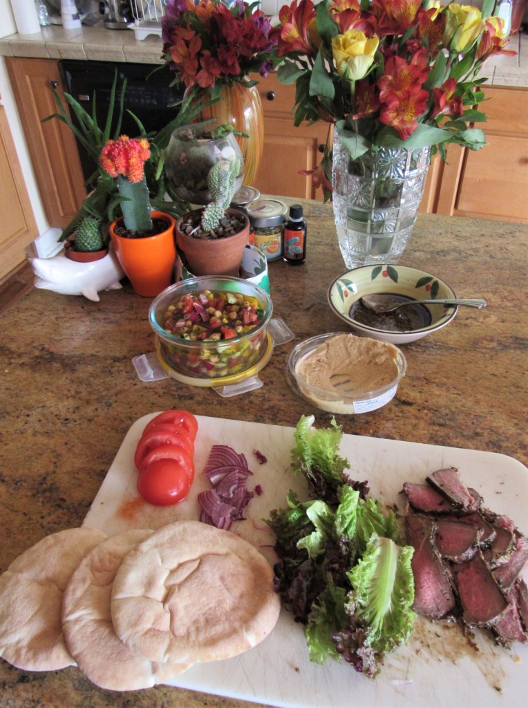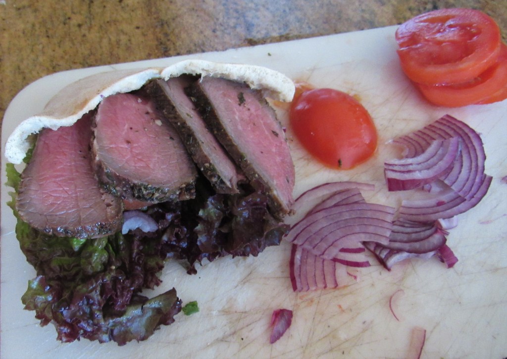 You all know how much I love recreating my foods and turning the leftovers into something completely different from my “firstovers”. Sometimes it can be challenging, but I have turned it into a fun game. This time, I reused, repurposed and recreated my Romanian garlic steak Grilled and Garlicky and turned it into a Mediterranean pita sandwich. This lunch would easily be a lunch you would find in any Mediterranean bistro, whether here in the United States, or dining al fresco with the Mediterranean Sea as your backdrop. I should have used the pocket pitas instead of the regular pitas, but it still worked out and tasted great, and that is all that really matters.