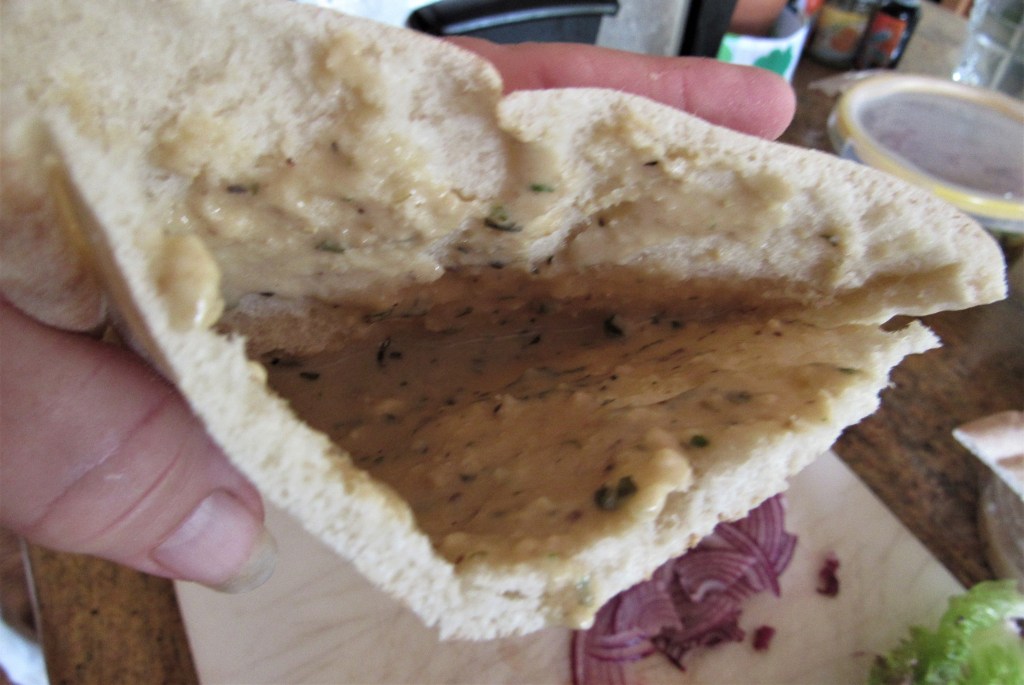 For my Mediterranean spread, I used some of the juice from my Mediterranean salad Mediterranean Fresh mixed with some hummus. I spread that on the inside of the pita pocket. I didn’t need to do anything else for the sauce because the juice from my salad already had so much flavor.