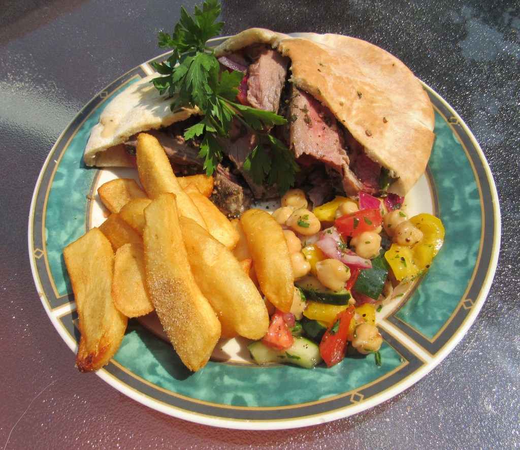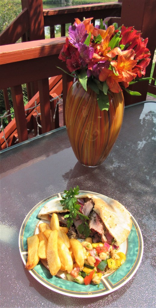 Once our pitas were “built”, I plated everything up with some steak fries and my Mediterranean Fresh salad. This made for a very quick and easy-peasy lunch that we thoroughly enjoyed out on out beloved deck, overlooking one of our lakes.