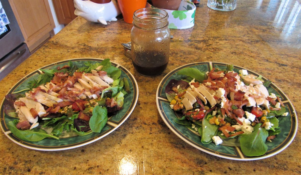 I cooked up some bacon and crumbled it, then I started building my salad with the mixed baby greens, and added my Asian green bean salad, followed by the chicken breast. I added some goat cheese crumbles onto Larry’s salad, and topped it all with the left over dressing, to which I added some more olive oil, and topped it all with the bacon crumbles. I added more olive oil to my leftover dressing to both extend it and to make it it a little less pungent, since it was a very spicy marinade to begin with.