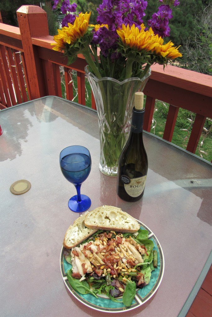 To complete the meal, all that was needed was a little warmed ciabiatta and a glass or two of a cool, crisp, buttery chardonnay, and voila! Dinner was served, out on the deck, overlooking our lakes. It was a perfect way to enjoy the summer evening.
