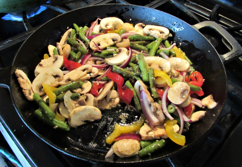 Slice the vegetables and saute together with the garlic and ginger until they are tender. Then add the beef and mix together well.