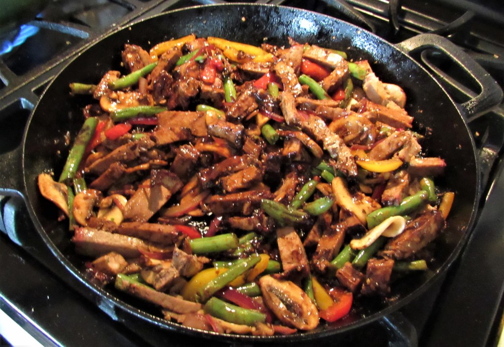 Stir-fries are as versatile as they come, and you can use any combination of meats, seafoods and vegetables you like. This time I used some red and yellow bell peppers, green beans, mushrooms, green onions, red onions, ginger, garlic and cilantro with my beef brisket.