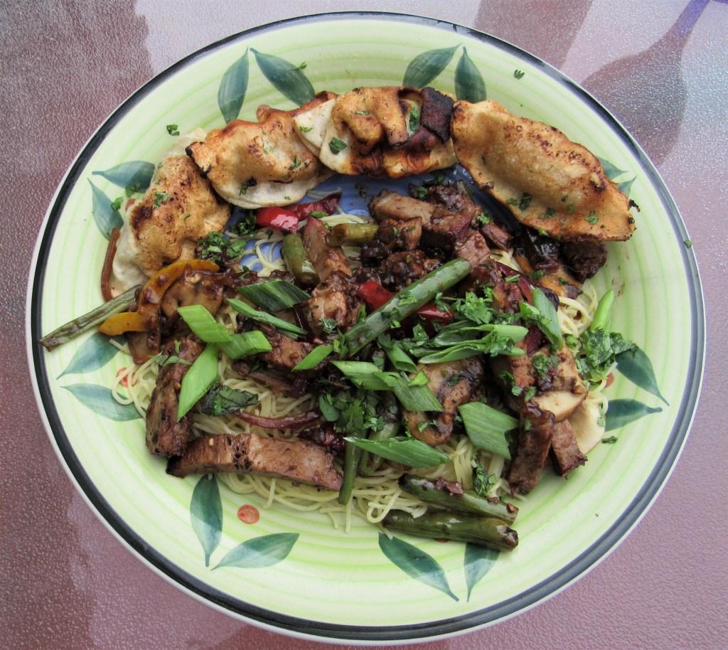 We often cook a lot of things up in quantity and then freeze them to pull out at a later time. We had some brisket that we smoked and froze awhile ago and it just made its way into our culinary rotation. What was I going to do with all this brisket. HMMMMM?????? I turned it into an Asian stir-fry with a teriyaki sauce and vegetables that I served over some leftover pasta with some fried potsitckers on the side. Because my dish was a beef dish, I served it with a smooth red blend as my wine choice.