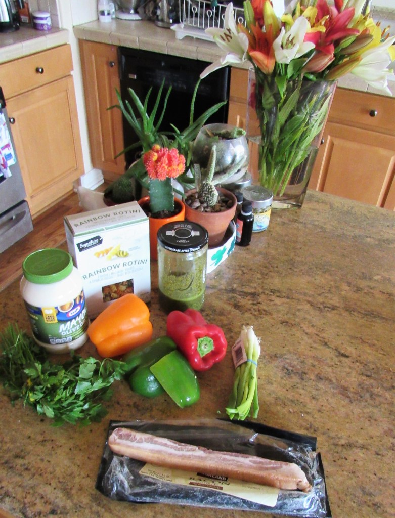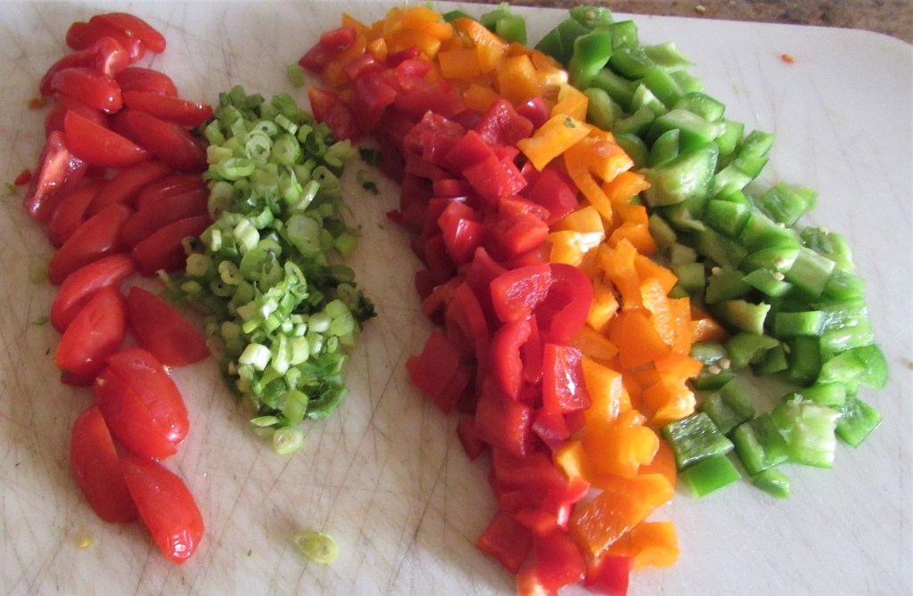It’s colorful, full of vegetables and full of flavor. This time I used red, orange and green bell peppers, green onions, cherry tomatoes and bacon.