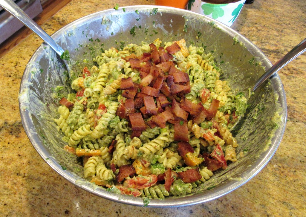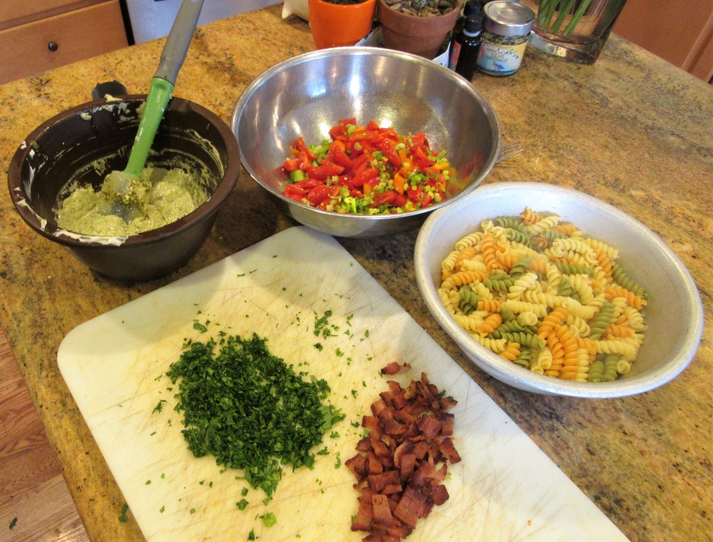 I had pesto and I had pasta. All I needed to do was to cut up a few vegetables and cook up some bacon. Then I tossed it all together for a deliciously cool summer salad.