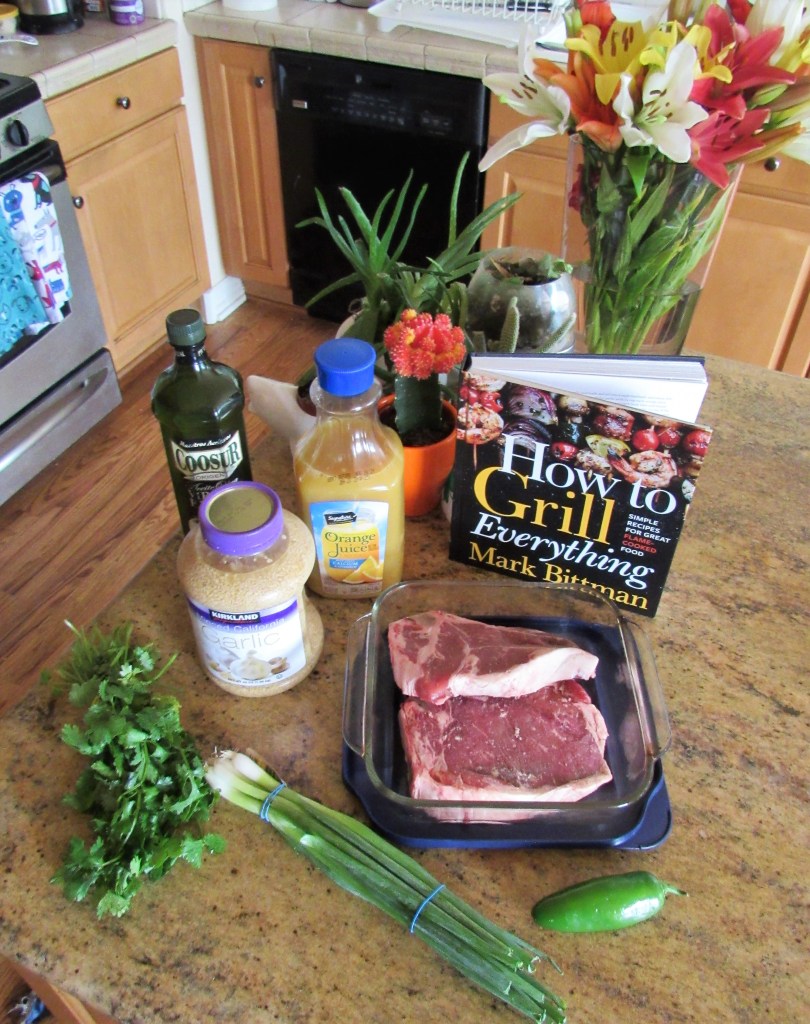 It was a another steak night, but of course I had to try it in a different way. After all, I can’t fix it the same way time after time, right?! 🙂 This time I marinated it in orange juice, jalapenos, green onions, cilantro and garlic to give it a little bit of a Caribbean flair. I served it with some vegetable quesadillas on the side, making it even more Caribbean and South of the Border style.