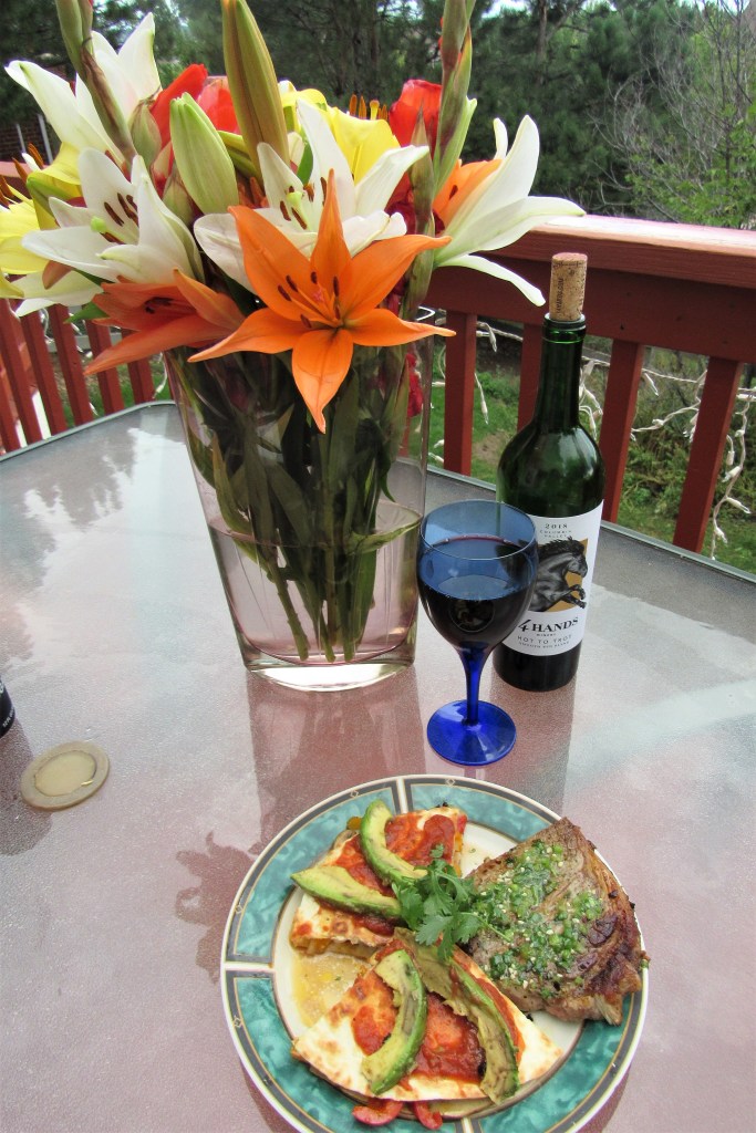 When the steak is done to your level of perfection, remove it from the skillet and top it with the remaining marinade and serve with your favorite side dishes. Because this was steak, I chose a nice, full-bodied red to go with it.