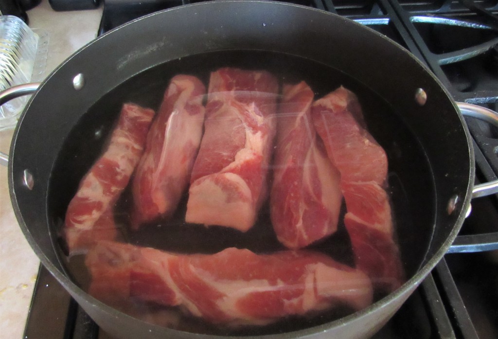 Place the ribs in cold water and bring to a boil, then reduce the heat to a simmer and continue to cook for about 30 minutes, or more depending the thickness and size of the ribs.