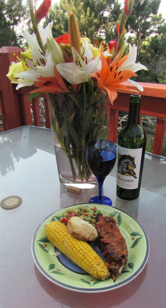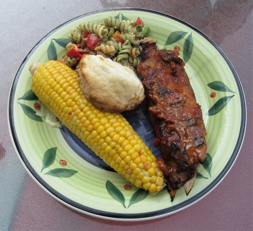 Ribs. You are either a fan or you are not. I have to admit, I am not, but Larry is. So every now and than I do make ribs. He prefers the smaller baby back ribs, but I like the meatier short ribs. Some of the main reasons why I am NOT a rib fan are that 1) they are hard to eat; 2) they are way to messy; 3) they are very fattening and 4) for the amount of meat you get, they are just not worth all the effort that goes into eating them. Though, the short ribs are a lot more satisfying, and are definitely a lot meatier, so they are more worth it, at least to me. That being said, it was once again a rib night. They were the short ribs. I served them with my pasta salad and some corn on the cob, some biscuits and a bold and fruity red on the side to make a perfect summer meal. Pesto Pasta Salad