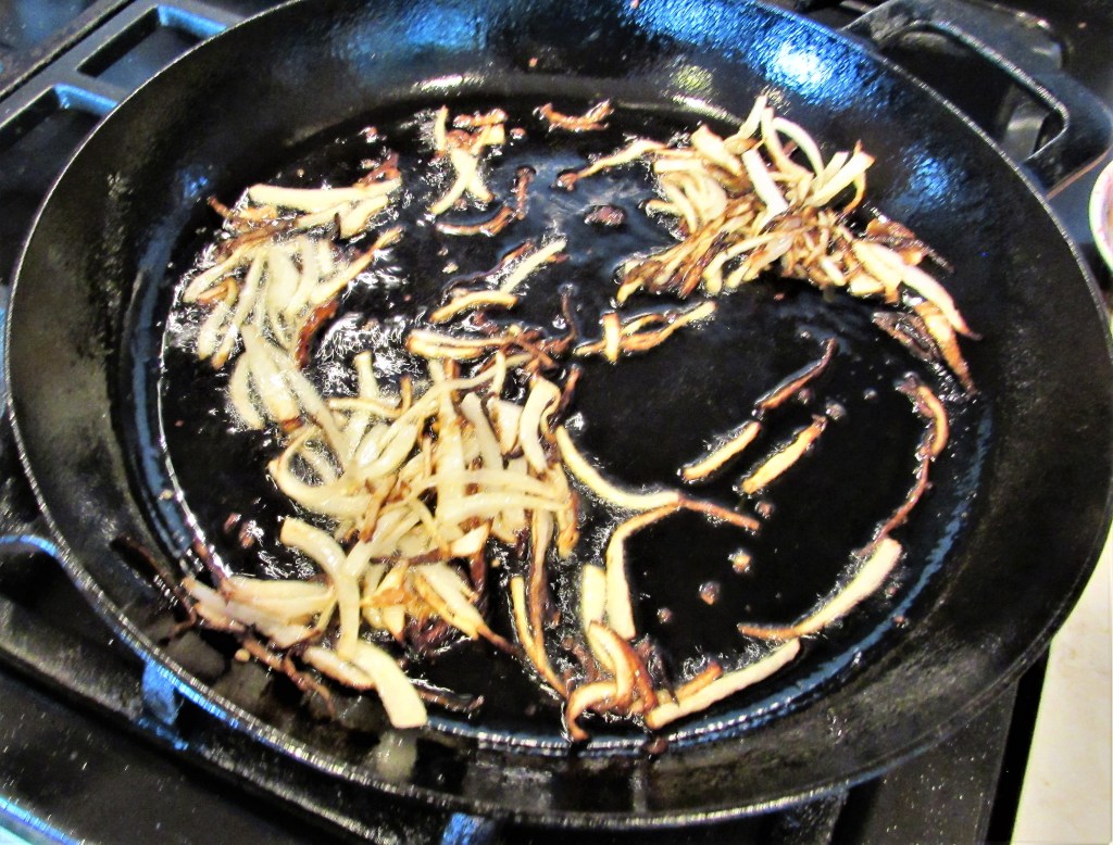 Caramelize the onions first. Once they start browning, remove them from the heat and seat aside.