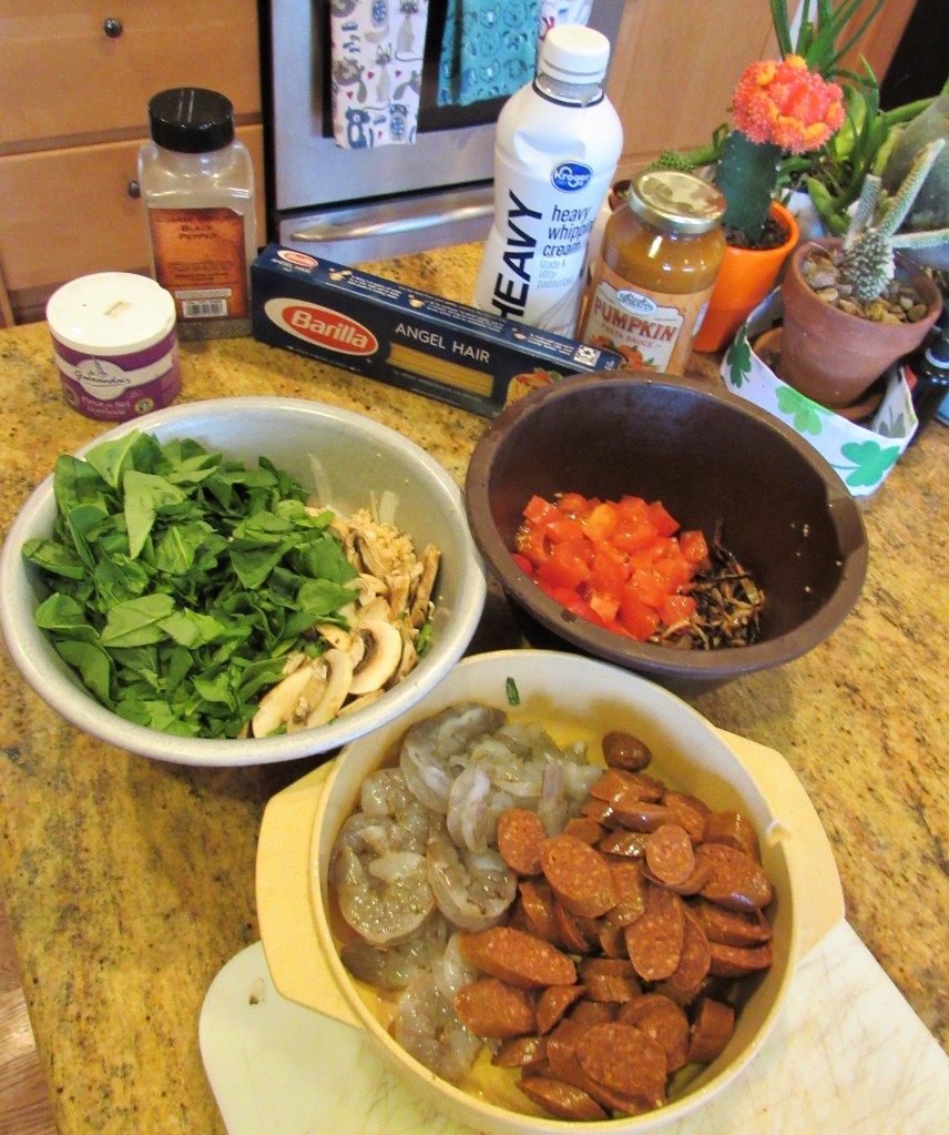 When everything is done, spoon it all up over some angel hair pasta, and voila! You could add chicken too, if you prefer. Simply delicious, especially with a cool, crisp chardonnay on the side. As you can see, pumpkin is NOT just for pie anymore.