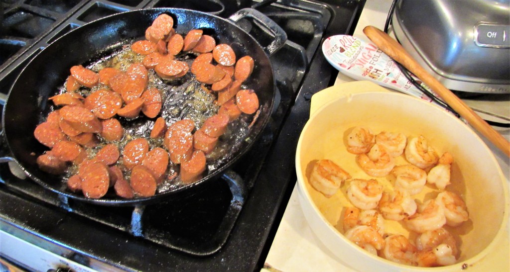 Add the shrimp to the skillet and cook until they are completely pink, then remove. Then cook the chorizo.
