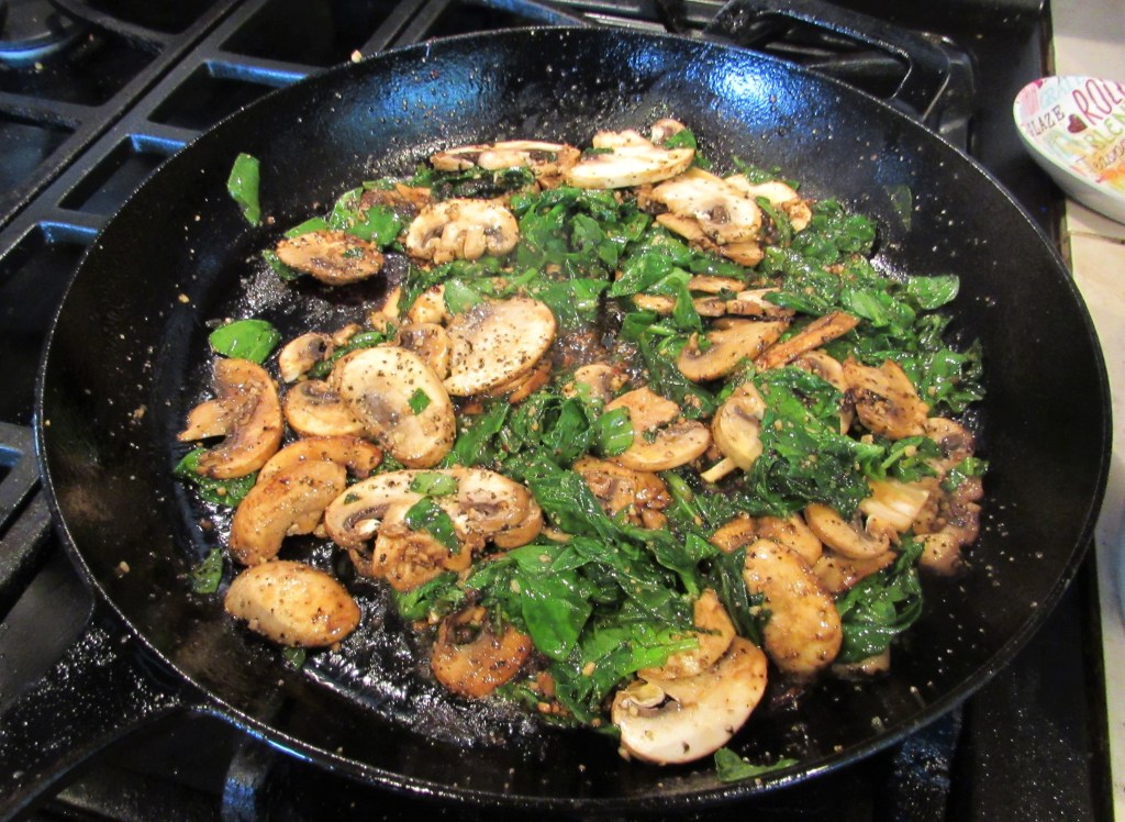 Once the chorizo and shrimp are cooked, remove them as well. Add the spinach, garlic and mushrooms next and cook until the spinach is wilted and the mushrooms are cooked.