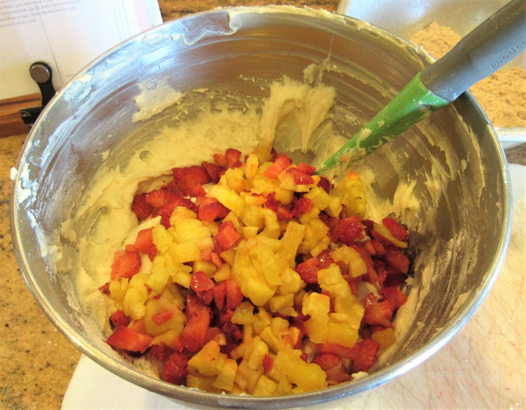 I have been baking a lot again these days, now that I have found a home for all my baked goods without having me eat them all. I have been mixing a lot of my baked goods with some store-bought goodies for the Church coffee cart. Every week, I offer a variety of different items. I never really know what I am going to provide until the time comes to put it all together. So far, everything offered has been a huge hit. This time, I made a coffee cake with a tropical twist, by adding some chopped strawberries and pineapple to the mix.