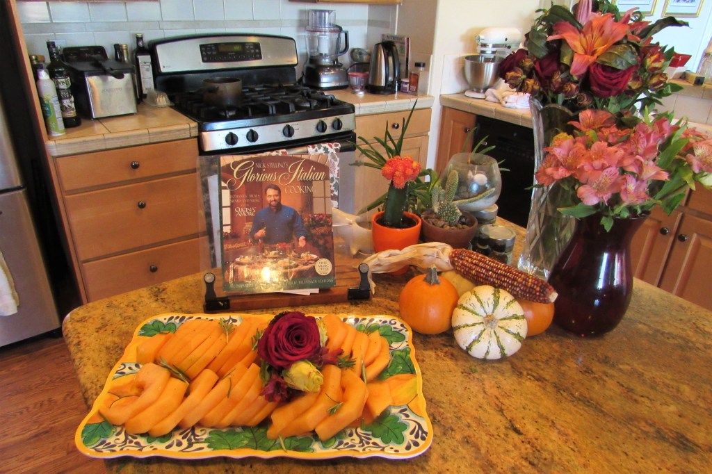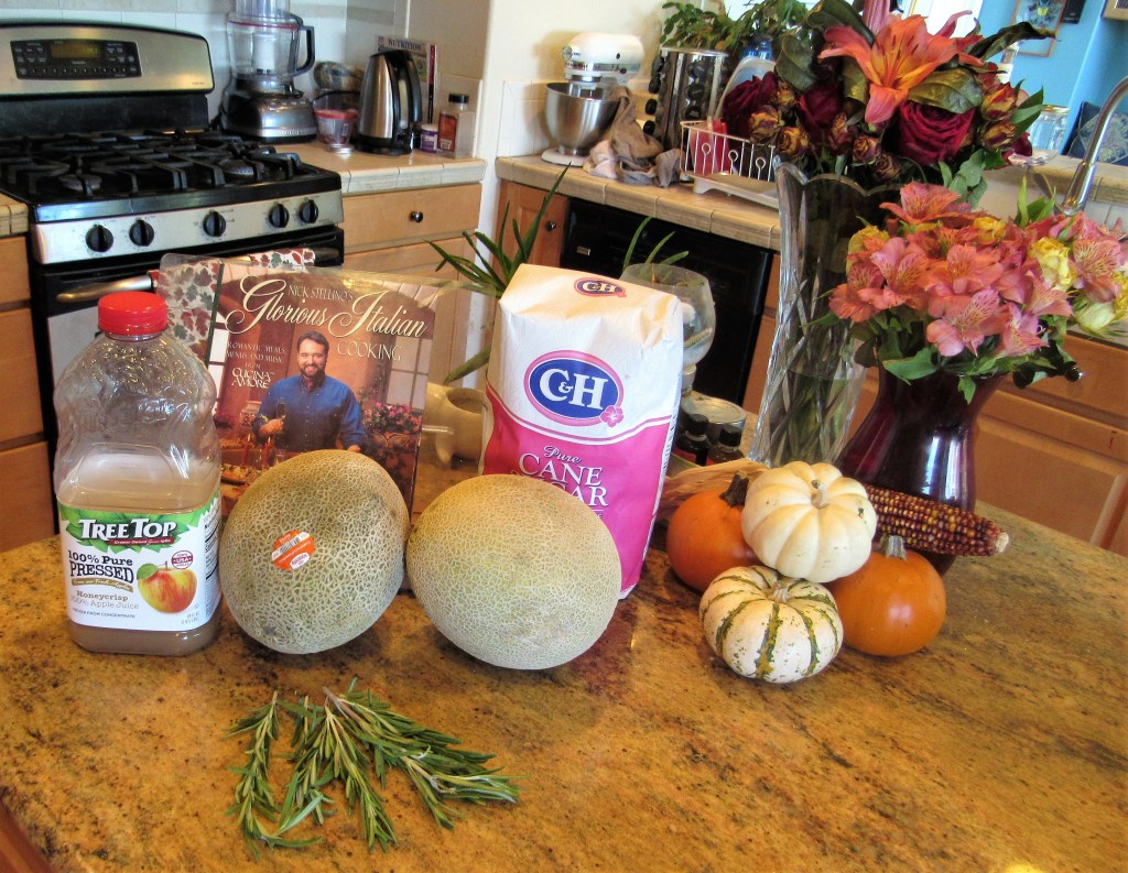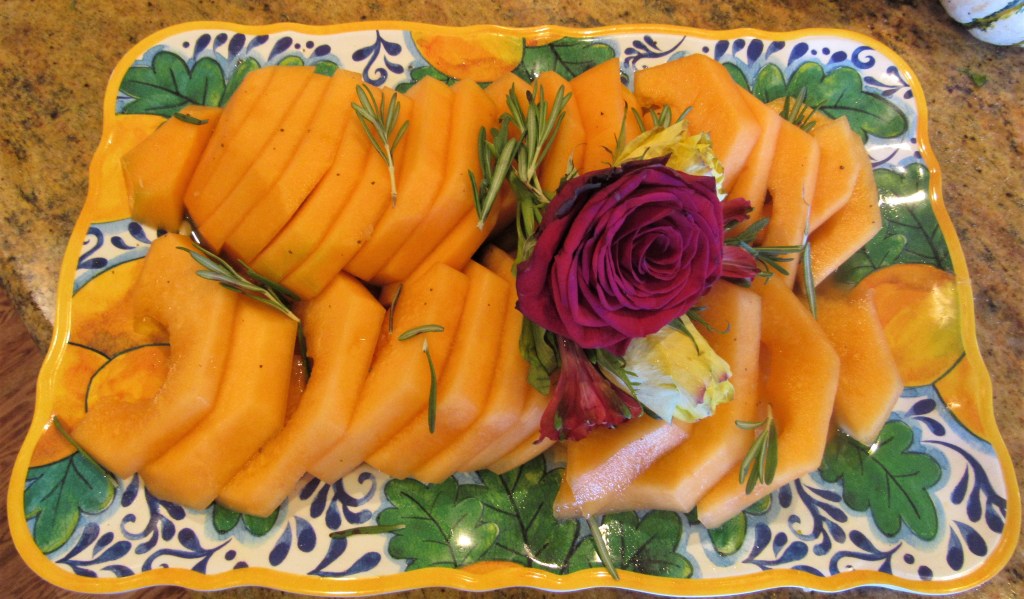 The romantic languages of French, Italian and Spanish always make everything sound so exotic and fascinating, even when in reality, they are just simple things. Maybe, that’s why they are called the romance languages. π This is certainly true with this simple, easy recipe as well. I took cantaloupe and doctored it up a bit with a simple rosemary and apple syrup and with a flick of the wrist, it became melone stile esotico. Doesn’t that sound a lot more intriguing than just plain cantaloupe?