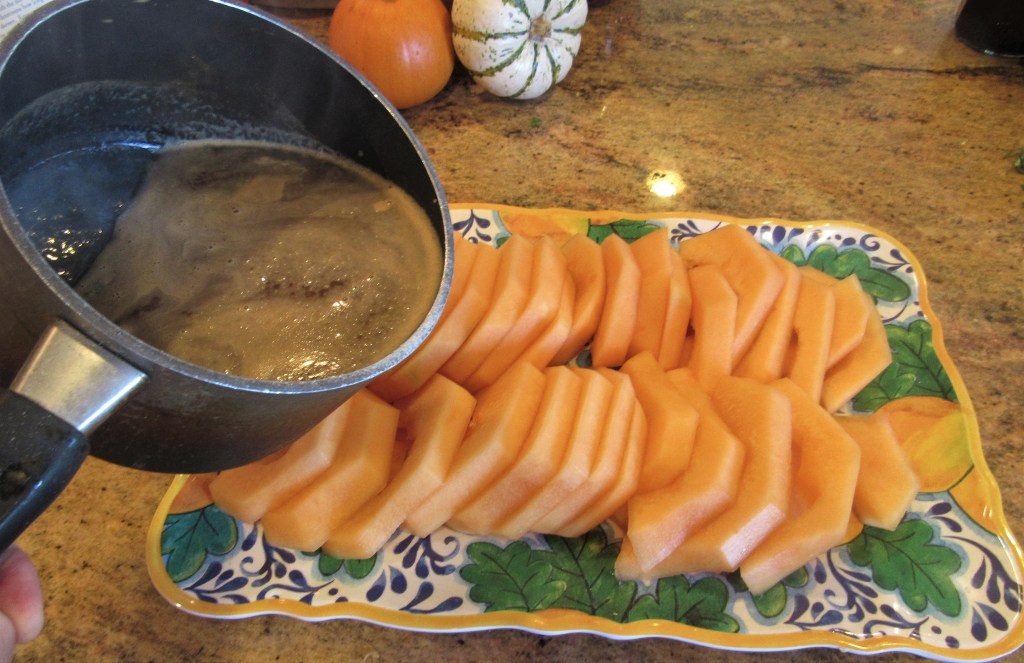 Remove the rosemary sprigs and discard, then spoon or pour the sauce over the cantaloupe.