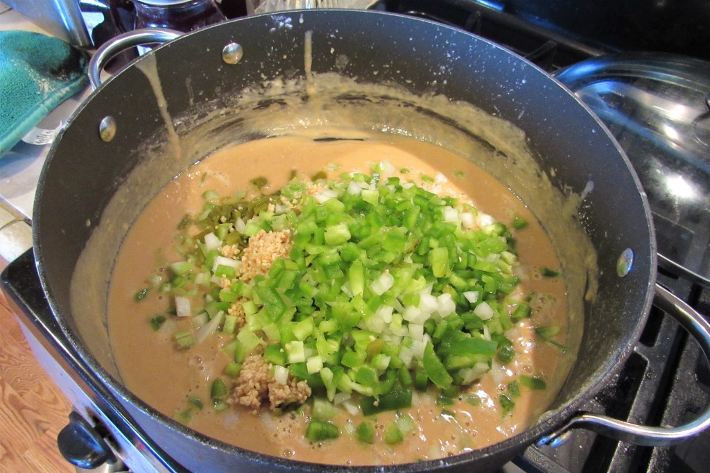 Once the roux gets to the color and consistency you like, add the Holy trinity, which is green bell peppers, onions, and celery. I always add jalapenos or roasted peppers too, so I call it the Holy tr1nity +1. We recently purchased our bushels of roasted Hatch chilies, so I used some of those in the mix. Another Hatch Batch Continue to whisk everything together for about 5-10 minutes, or until the onions are translucent. The roux will thicken as it cooks too.
