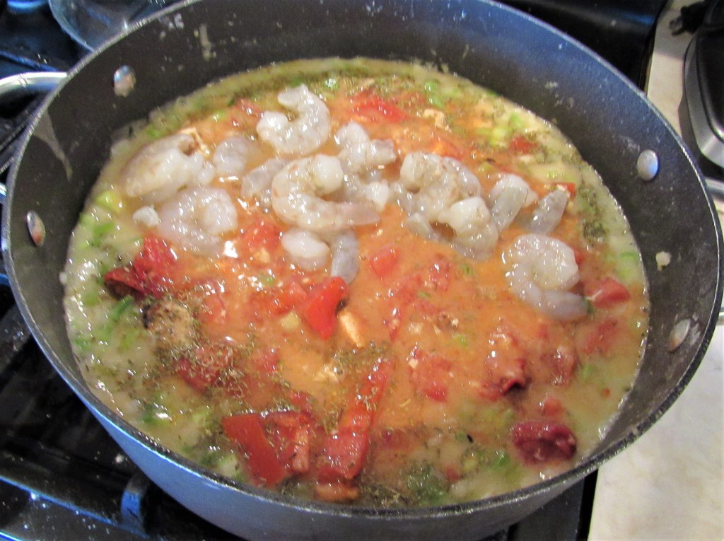 Add the chicken, and sausage and continue to cook until they are cooked completely. Then add the rest of your ingredients. Add a minimum of 6-8 cups of chicken broth, but more if like it a little thinner and more soup-like. I added the shrimp along with the broth, tomato and seasonings. I used oregano, marjoram, thyme, salt and cayenne pepper as my spices. In Cajun and Creole cooking, the best cooks NEVER measure anything. It is all by taste, by touch and by the looks. I probably added about 1-1 1/2 tsp of each of the dried herbs.