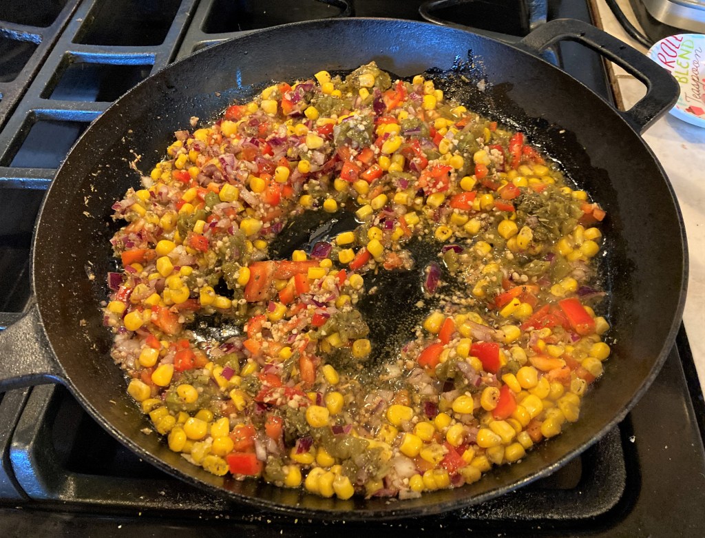 Saute everything except the cilantro and the flour together in a large pot with the lime olive oil (regular olive oil works just fine too) until everything is thoroughly cooked. Add the flour if you like your sauce a little thicker, especially since using it as a filling, and continue to cook for about5 minutes, stirring constantly to incorporate the flour. Add the cilantro and mix together well. Then remove from the heat and set aside until you are ready to use it.